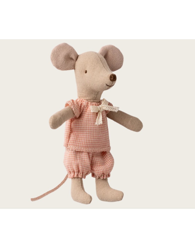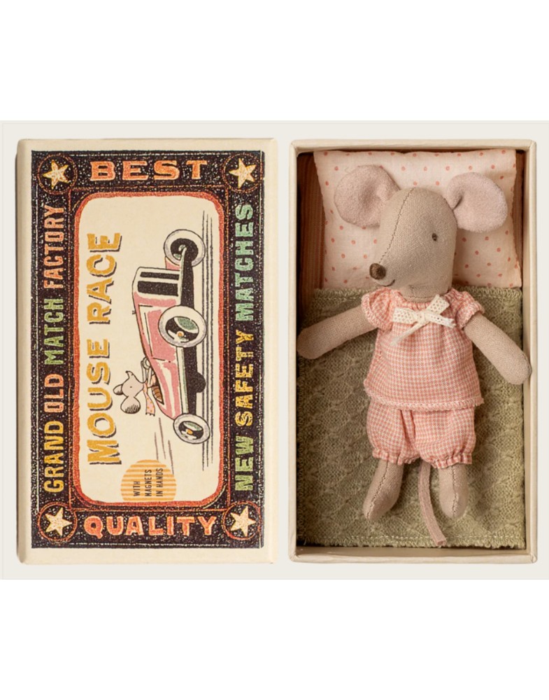 Diese Maus ist ein klassischer Maileg-Artikel, bereit für stundenlanges Spielen und festen schlaf in ihrer kleinen Streichholzschachtel. Die Kleidung und Bettwäsche bestehen aus weichen Stoffen mit tollen Drucken. Die Maus hat Magnete in ihren Händen