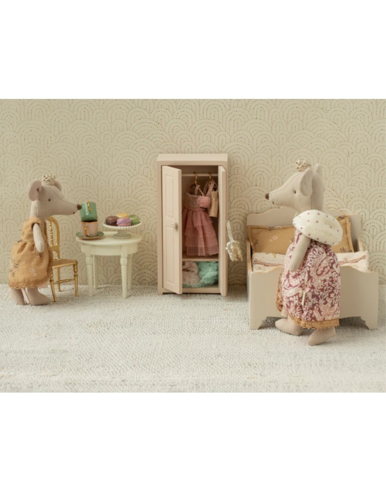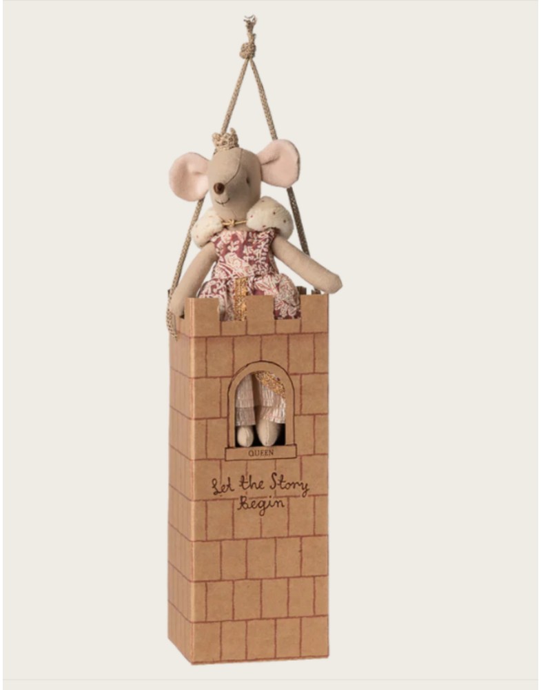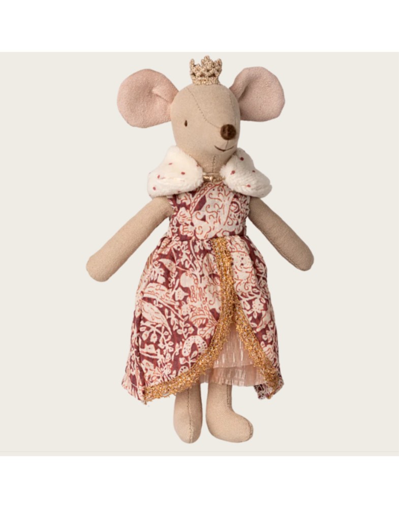 Die Köningen Maus in Größe Mama ist bereit, Gastgeberin in ihrem Schloss zu sein. Sie trägt ein wunderschönes königliches Kleid und eine Krone und passt perfekt in den Schlosssaal.